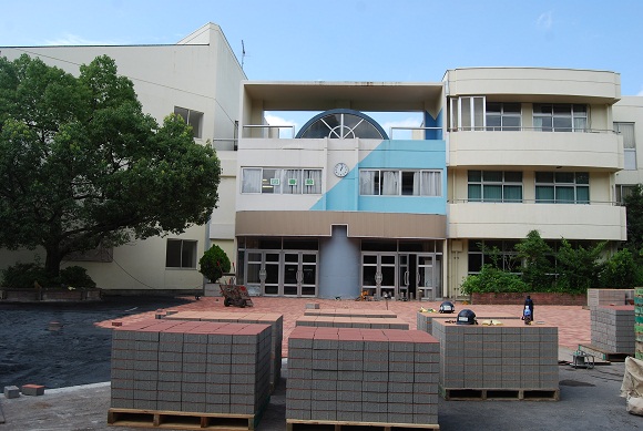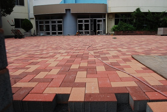 昇降口前のタイルを掘り起こした所、今日一日でレンガが敷き詰められた。凄いなあ!