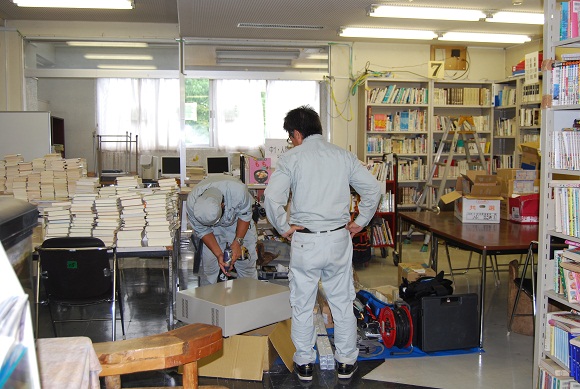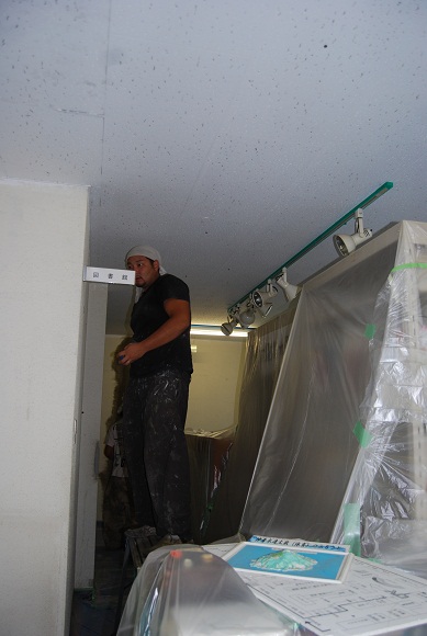図書館も着々と…。図書館前廊下壁面の補修・ペンキ塗り。館内では、PCコーナーへの光ケーブル導入とサーバーBOXの新設置。