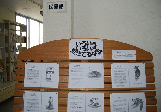 (写真は図書館・表示板「いろいろ いろいろ 生きてるな―多様な生物」)