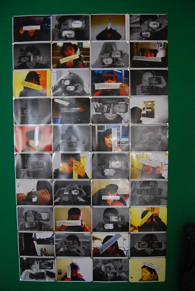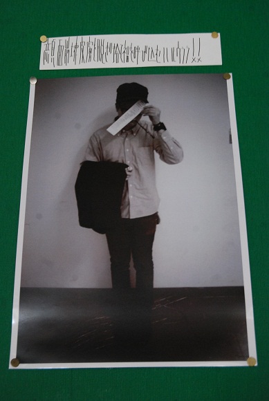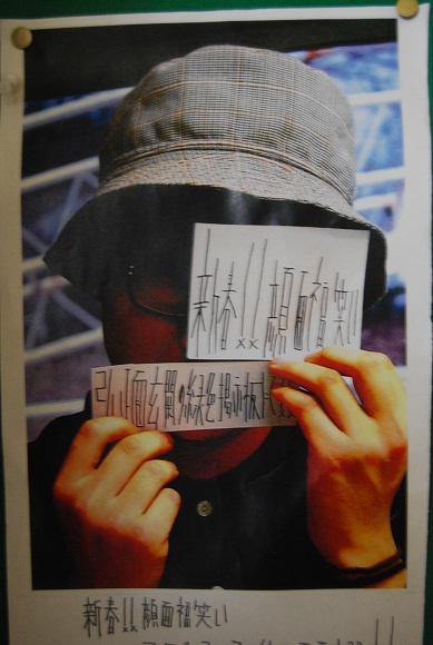 正面玄関、「購買」隣の緑の大きな掲示版の半分を使って、高3生徒の写真展『新春!! 顔面福笑い!!』が始まった。この場所の、この「写真展」の、この発想、実に面白い。やるなあ、イイダ バク君。
