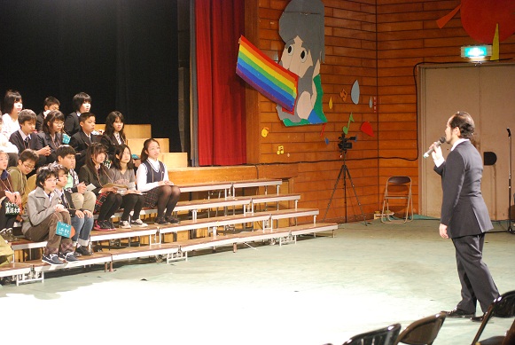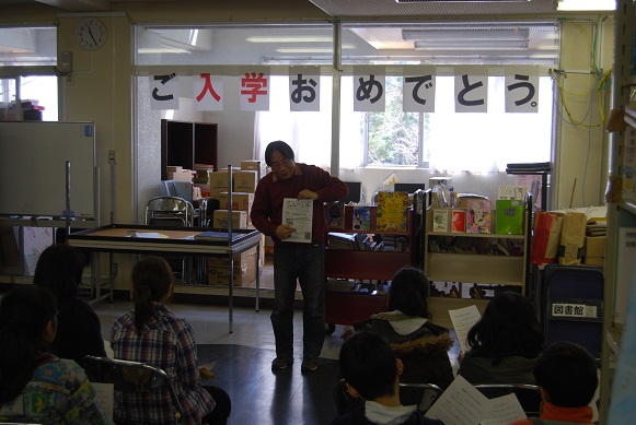 ※ここで一拍おいて、ブックトラックに用意していた、ギネスブック・震災&原発関連図書・コミック雑誌「花ゆめ・絵本「ミッケ(がっこう)」・「もしドラ」・バースディブック等を紹介する。そしてスペシャル資料として、(1)担任が卒業生なので該当する「卒業アルバム」と、(2)中1当事者の「4/8中学入学式DVD」を取り出す。(笑)