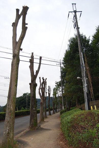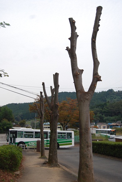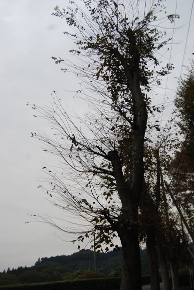 あまりの落葉に刈り込みが入った樹木たち。