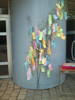 正面玄関に、突然、七夕の笹飾りが登場した。(笑)短冊に書かれた願いは。…「食堂のタンドリーチキンを毎日出して下さい。」「恋がみのりますように♡」「歌がうまくなりたい!」「心の大きな優しい人になる。」「笑いがたえませんように…ささやかな幸せも、」「日本が超平和な国になりますように…」等々。