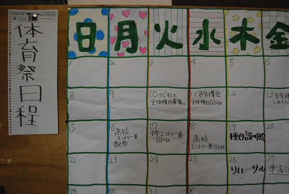 正面昇降口には日程表が貼り出され、階段にもアピールが…。