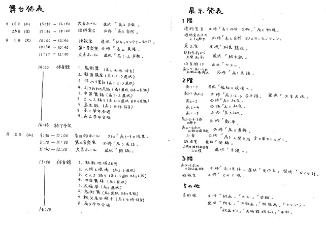 高校学習発表会は、3/1…舞台発表(主に高1・2)、3/2…舞台発表(主に高3)。展示発表は2/28~3/2である。