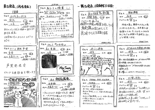このパンフレットには、[舞台発表のスケジュール][展示発表][舞台発表(校舎内)(体育館・1日目&2日目)]の詳細と、2日間のバスダイヤ等が記載されている。とても役立つ。