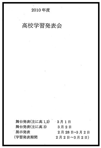 「2010年度高校学習発表会(3/1・2)」のパンフ(12p)が各クラスへ20部ずつ配布された。