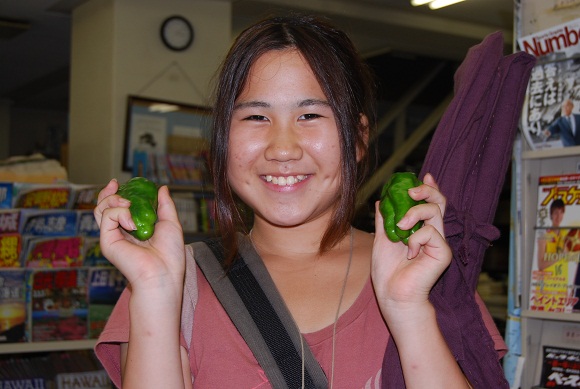 中学生から自分の家の畑で作ったピッカピカのピーマンを貰った。ありがとう!ニコニコ収穫のおすそ分けだ。この夏、ほとんど出勤して仕事をしていて良かったのだ。(笑)