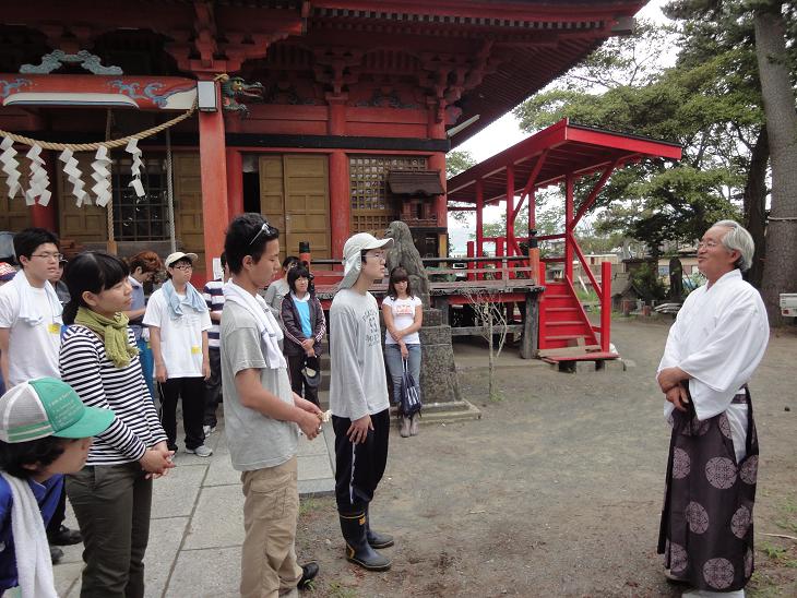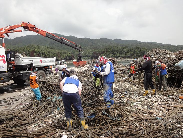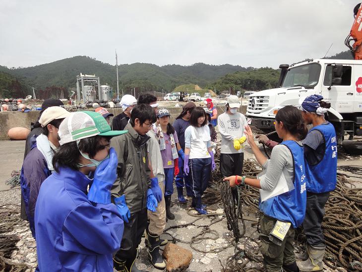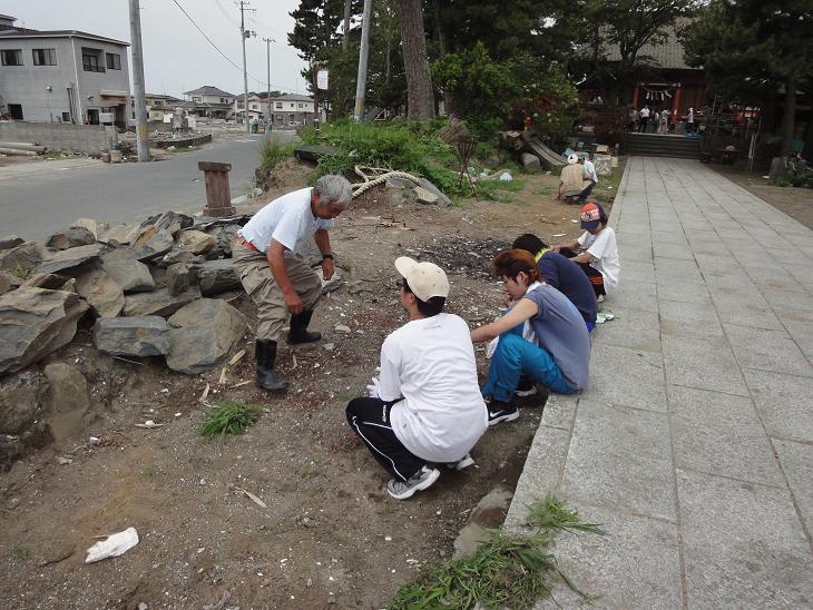 次の日、午前中に被災した神社のおそうじのお手伝いをしました。2グループに分かれて、1グループは参道の草むしり、もう1グループはガラスなどを拾う作業をしました。私は参道の草むしりをしました。一緒に作業をしてくれた神社の近くに住むおじさんが,「ひとつやれば,ひとつ片付く」という言葉を教えてくれました。やらなければ何も進まない…そんなメッセージが隠れているような気がしました。午後には、カキの養殖用の縄をほどく作業をしました。津波で海の中がかき混ざられ縄が絡まってしまって海から引き上げた縄が山積になっていました。ピースボートの人達などボランティアの人達がいました。日本のためにわざわざ海外から来てくれて私もボランティアに来てよかったなと思いました。どちらの作業もとても小さい事だけど,小さい事一つひとつこなしていかなくちゃなにも片付かない。作業をしながらそんな事を思いました。