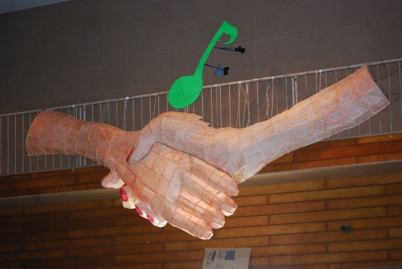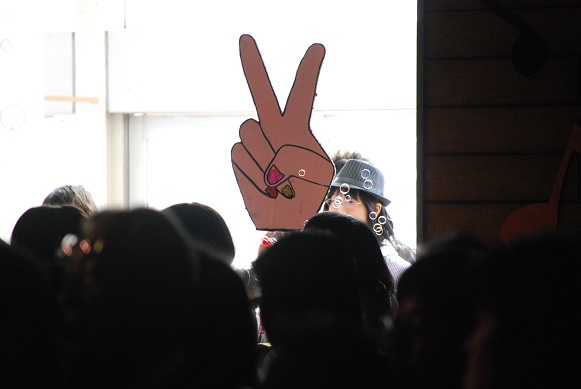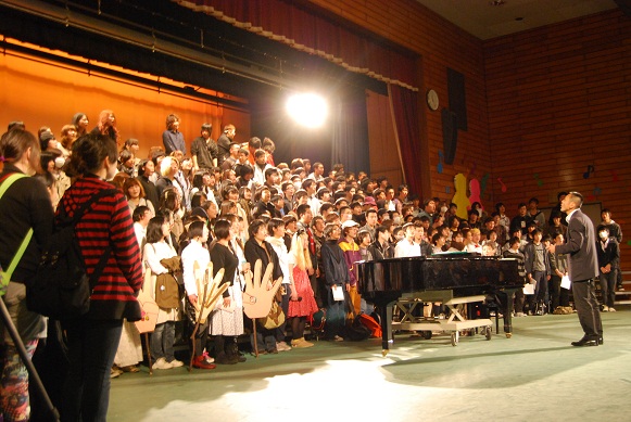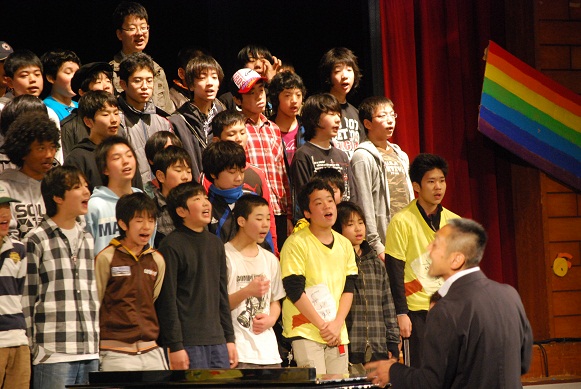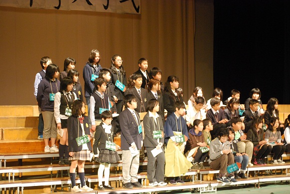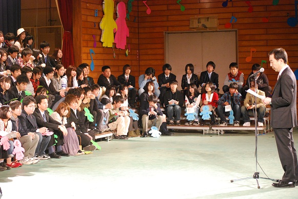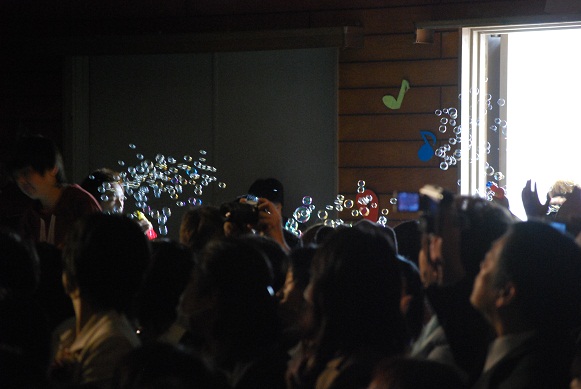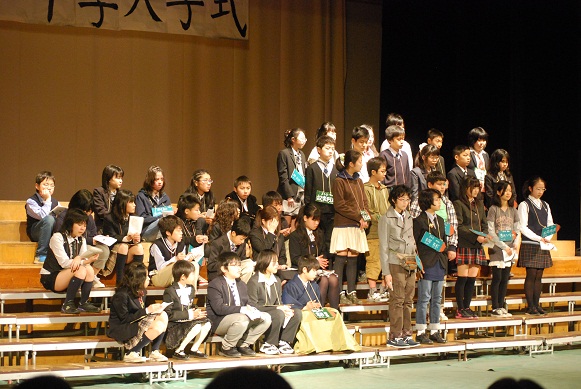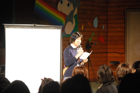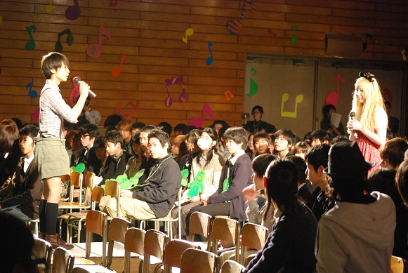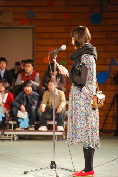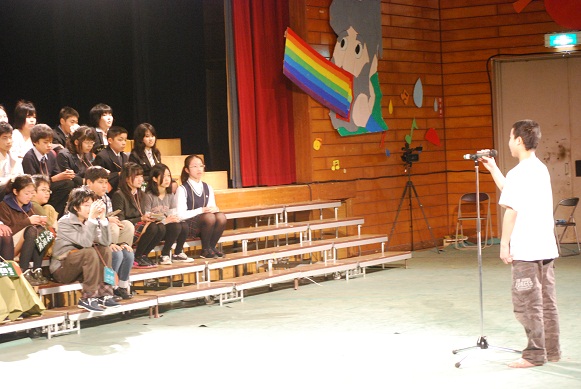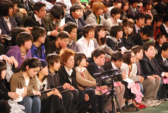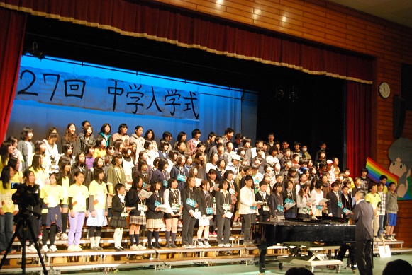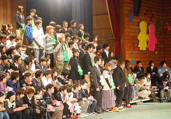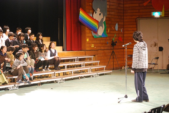 ※ここで一拍おいて、ブックトラックに用意していた、ギネスブック・震災&原発関連図書・コミック雑誌「花ゆめ・絵本「ミッケ(がっこう)」・「もしドラ」・バースディブック等を紹介する。そしてスペシャル資料として、(1)担任が卒業生なので該当する「卒業アルバム」と、(2)中1当事者の「4/8中学入学式DVD」を取り出す。(笑)