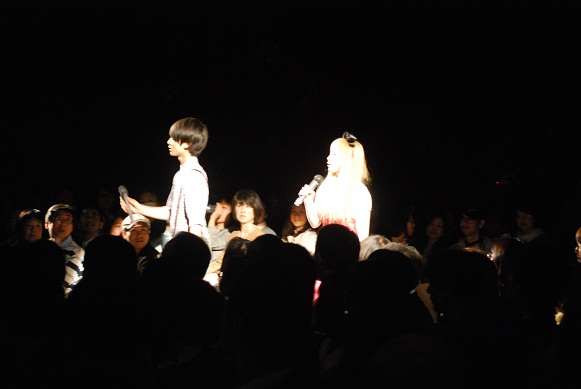 ⑥ 本の借り方は… と続き、司書二人で貸出・返却のパフォーマンスをして説明を終える。